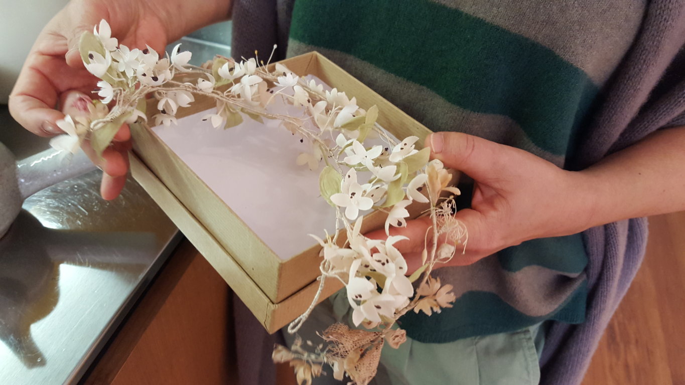 - Le decorazioni per i capelli sono fatte un petalo per volta, creando coroncine con i ritagli degli stessi pizzi dell’abito.