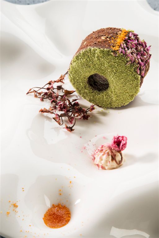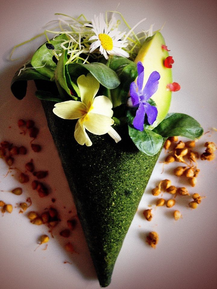 Ricordo il dessert del giorno: una ciambella di cacao crudo e grano saraceno germinato, farcita di composta d’albicocche, con una “panna” di mandorle, fiori di sakura sotto sale e umeboshi, marmellata di clementine polvere di mela verde. Era un dolce delizioso al palato e ricco di elementi nutrizionali importanti, un modo di intendere la cucina complesso e mentale – approccio che mi incuriosisce molto – lontano anni luce dal conosciuto e con il profumo di una nuova frontiera da scoprire. Lontano anni luce dal concetto di “imitazione” del famigerato tiramisù.