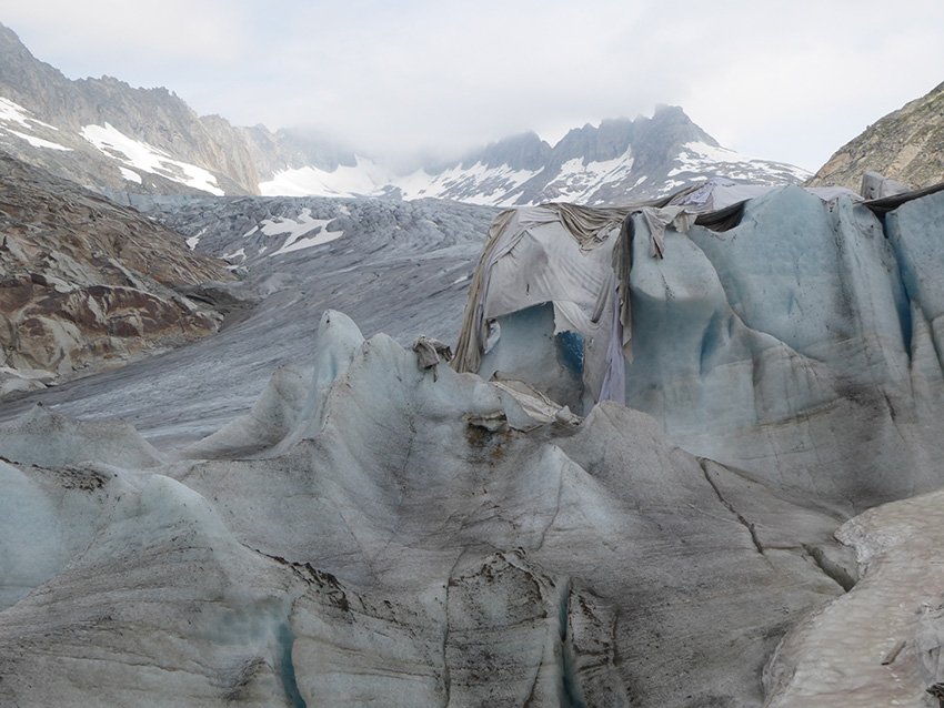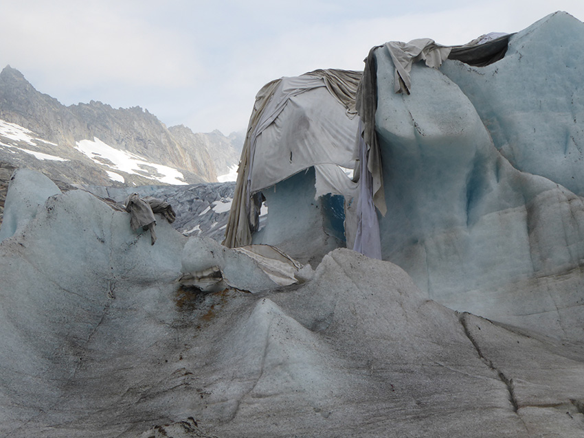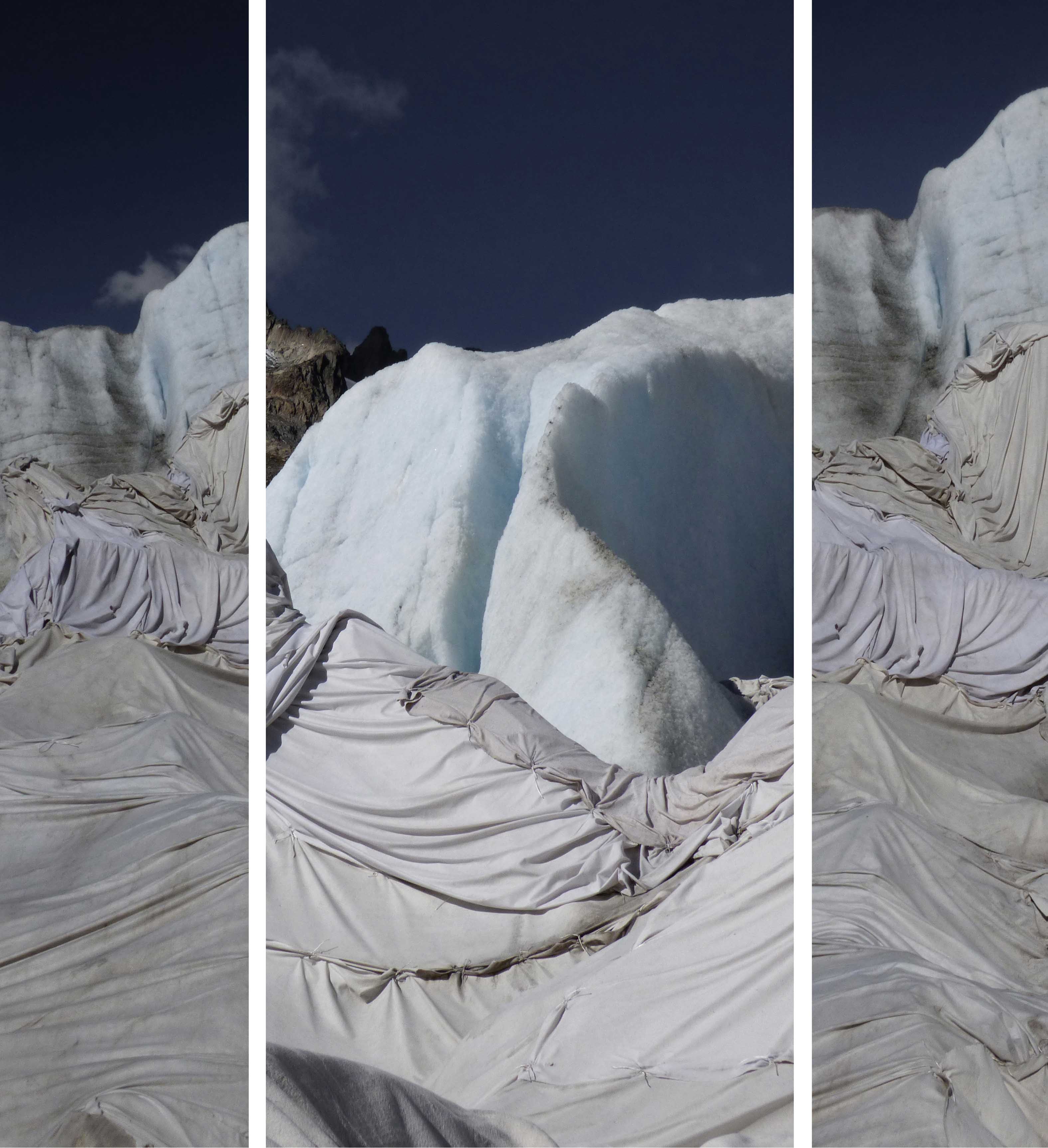 Il ghiacciaio sembra un malato grave. Riparato sotto teli che ne lasciano scoperte alcune parti – simili a membra consunte – rivela ancor di più il suo declino, la sua scoraggiante vulnerabilità.