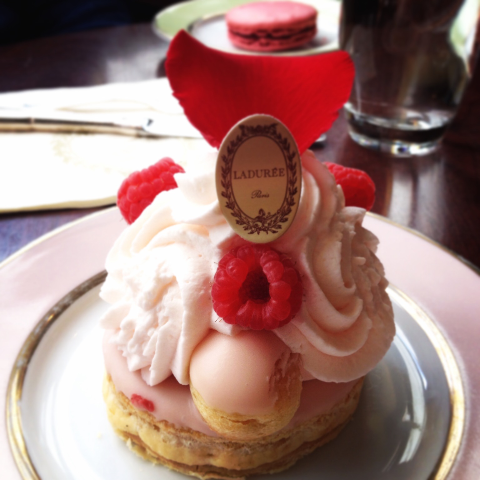 Ladurée mi ha visto scrivere articoli con il laptop in bilico tra ginocchia e tavolino, mi ha visto innamorata e mi ha visto molto incinta deliziarmi con una réligieuse alla rosa. In quel frangente la réligeuse mi assomigliava terribilmente, tutta tonda e lustra di glassa.
