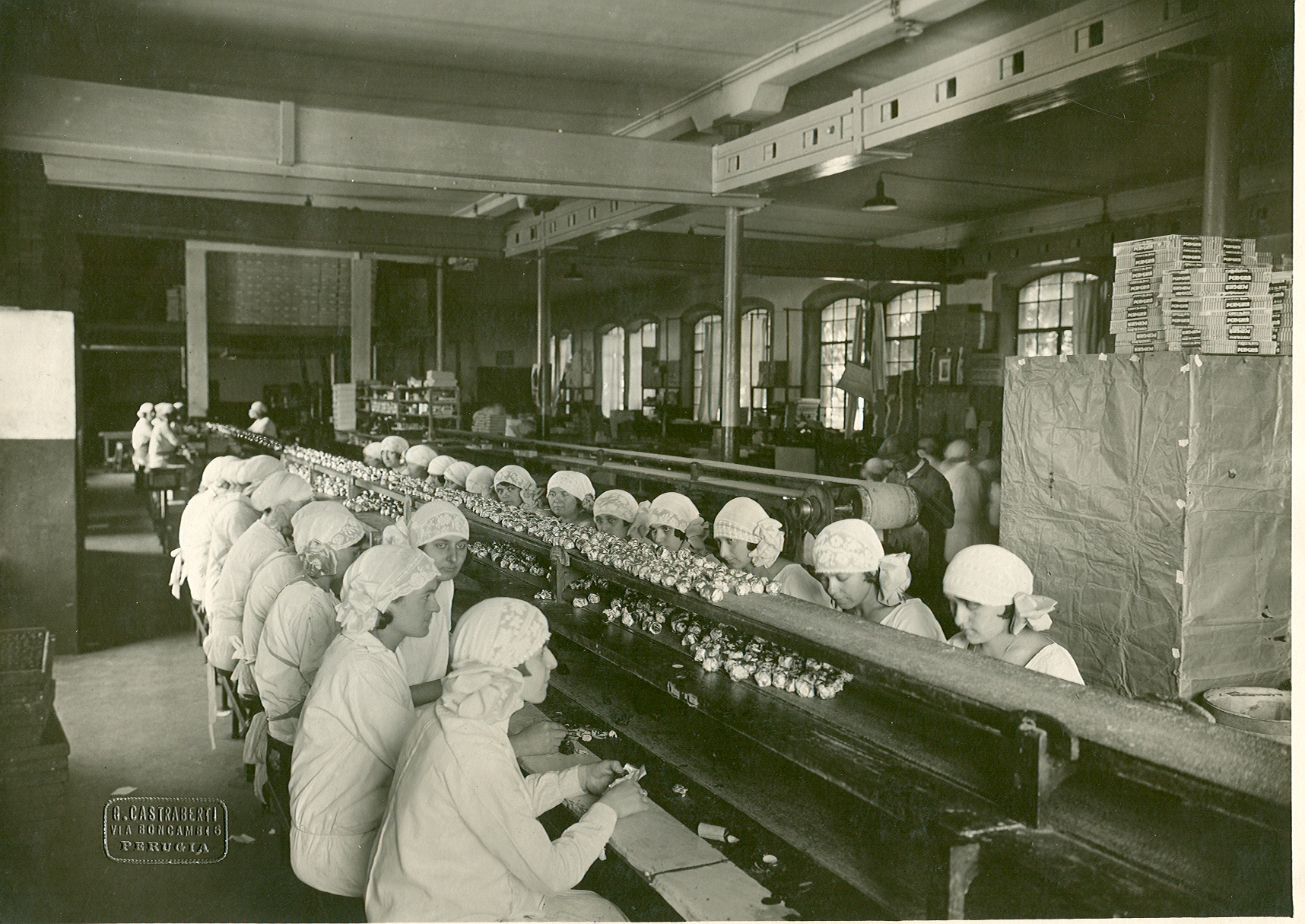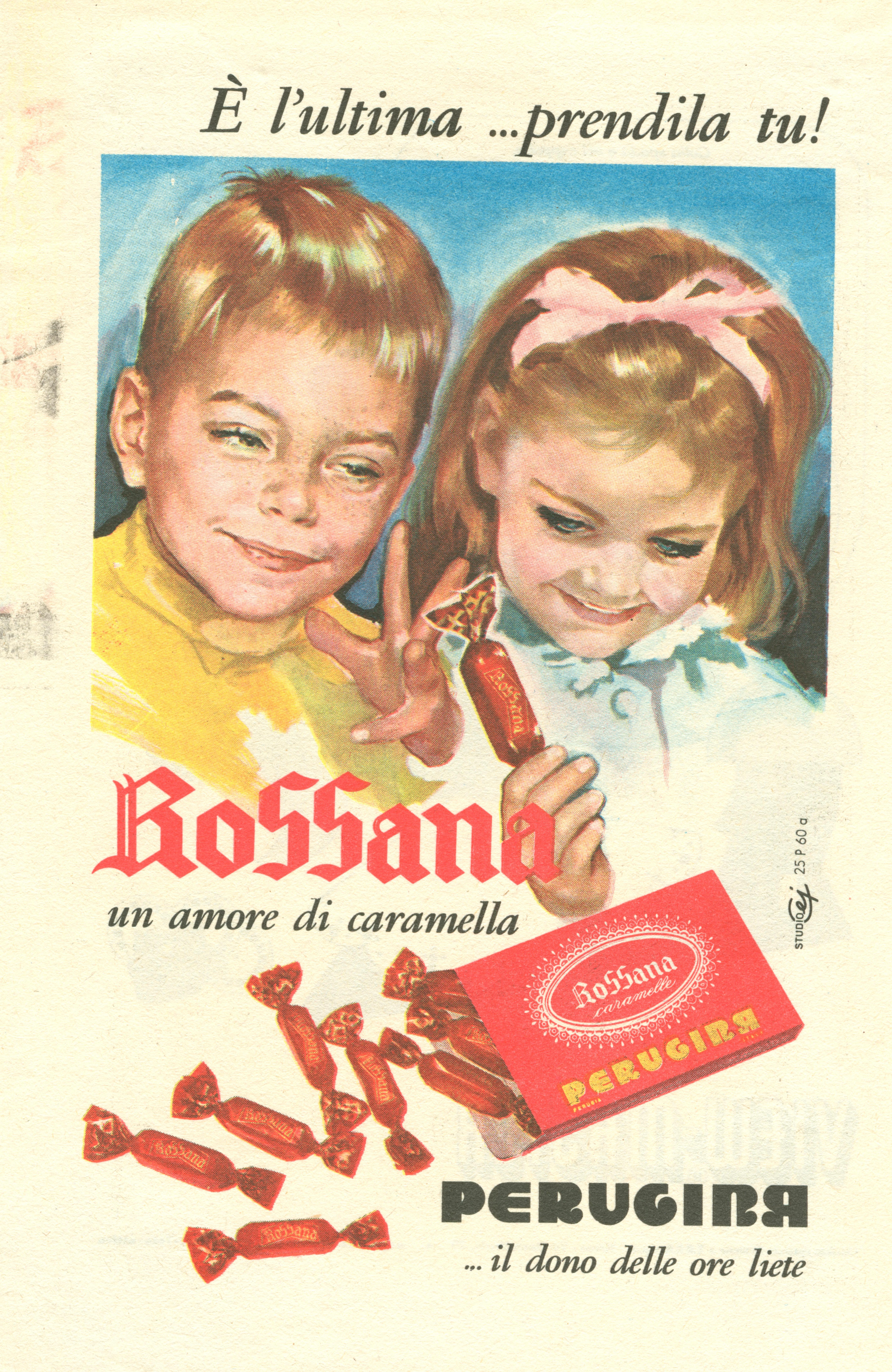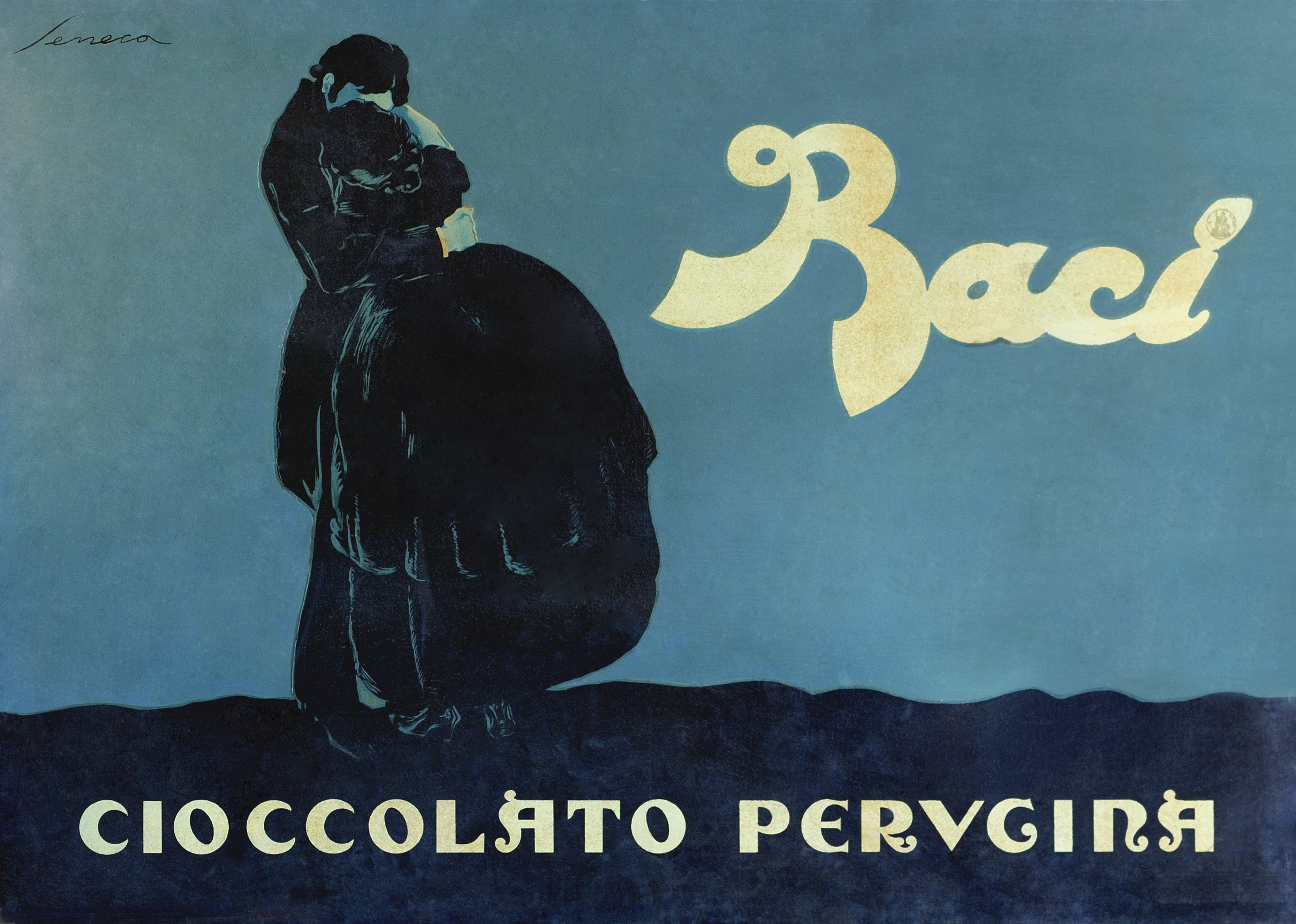 Luisa Spagnoli nasce a Perugia nel 1877 ed è dotata di straordinaria modernità, di grande creatività e intraprendenza, qualità che la portano a dare vita a due grandi aziende, anticipando di mezzo secolo l’evoluzione della presenza femminile nel campo del lavoro. Nel 1907 con un capitale sociale di 100.000 lire, il marito di Luisa Annibale Spagnoli – in società con Francesco Andreani, Leone Ascoli e Francesco Buitoni – fonda la Società Perugina per la fabbricazione dei confetti. È il 1922 quando Luisa, nel tentativo di contenere i costi di produzione, impasta la granella di nocciola, residuo di tante lavorazioni, aggiungendovi una nocciola intera e ricoprendola con il cioccolato fondente Luisa, di sua invenzione. Nasce così un cioccolatino dalla forma simile alla nocca di una mano, inizialmente nominato “Cazzotto” e poi ribattezzato Bacio da Giovanni Buitoni, mentre al Direttore Artistico della Perugina Federico Seneca si deve l’introduzione dei cartigli, i messaggi d’amore nascosti all’interno del mitico incarto stellato. Con un esplicito riferimento a un altro “Bacio”, il celebre dipinto di Hayez, Federico Seneca disegna poi la scatola blu e argento raffigurante la coppia che si bacia sotto una pioggia di stelle. Grazie al loro fondamentale contributo, il Bacio si trasforma da ottimo cioccolatino in leggenda. Un altro cult di Perugina è la Banana: non si sa se Luisa Spagnoli si sia ispirata veramente a una bambina che intingeva una banana nel cioccolato, ma certamente l’invenzione è riconducibile alla sua ricerca, così come i cioccolatini Tre Re, i Gianduiotti, il Grifo e i Nudi, le praline confezionate per la prima volta in scatola chiusa. Nel 1926 nasce la “Signora in rosso”, Rossana Perugina, la caramella dal “Cuore Segreto” di latte mandorla e nocciola, che deve il suo nome a Roxanne, la dama amata da Cyrano de Bergerac.