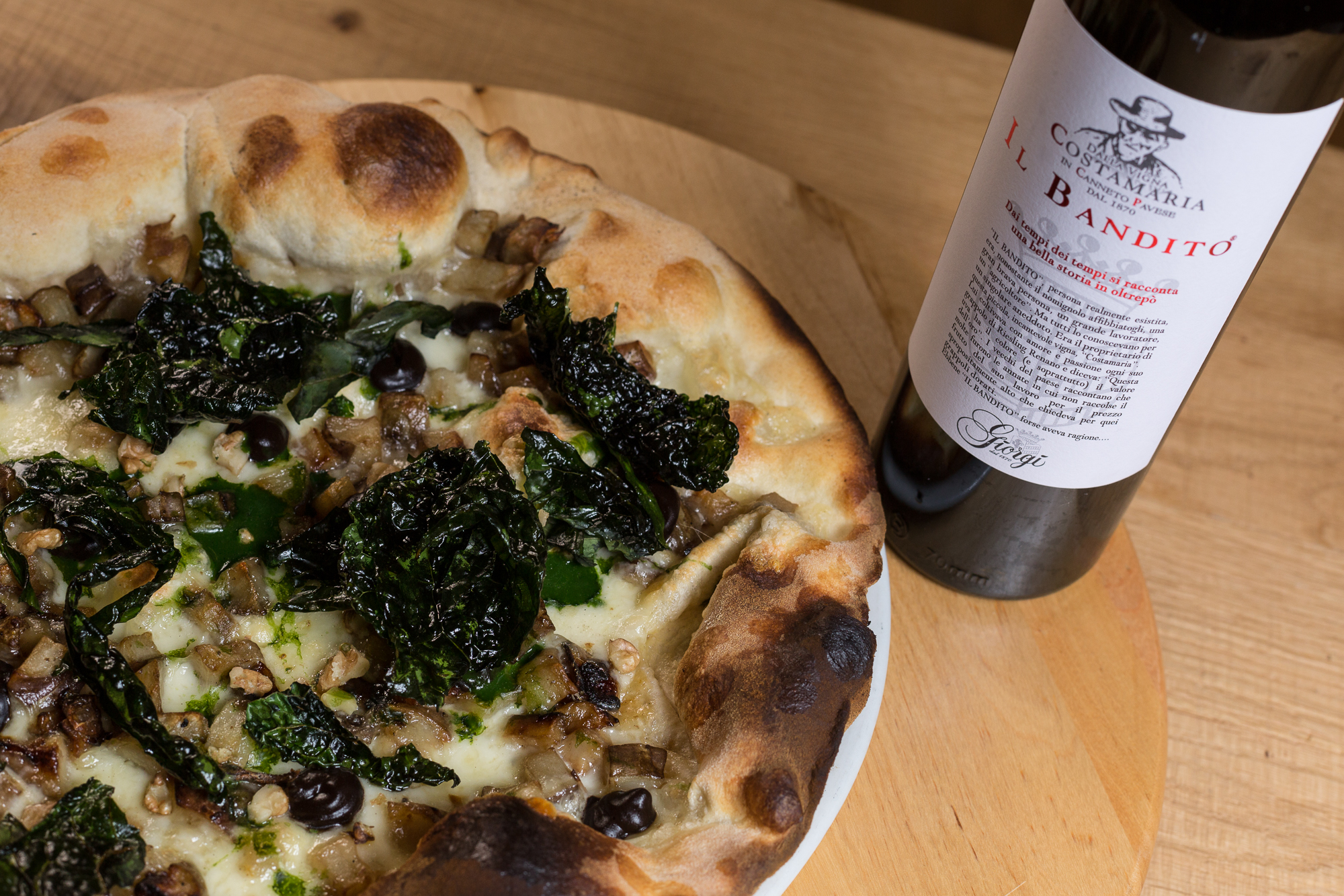 - Pizza bianca con fiordilatte, topinambur al forno, chips di cavolo nero, succo di cavolo nero e infuso di Pu’er ©Aromi Creativi_Ferrowine