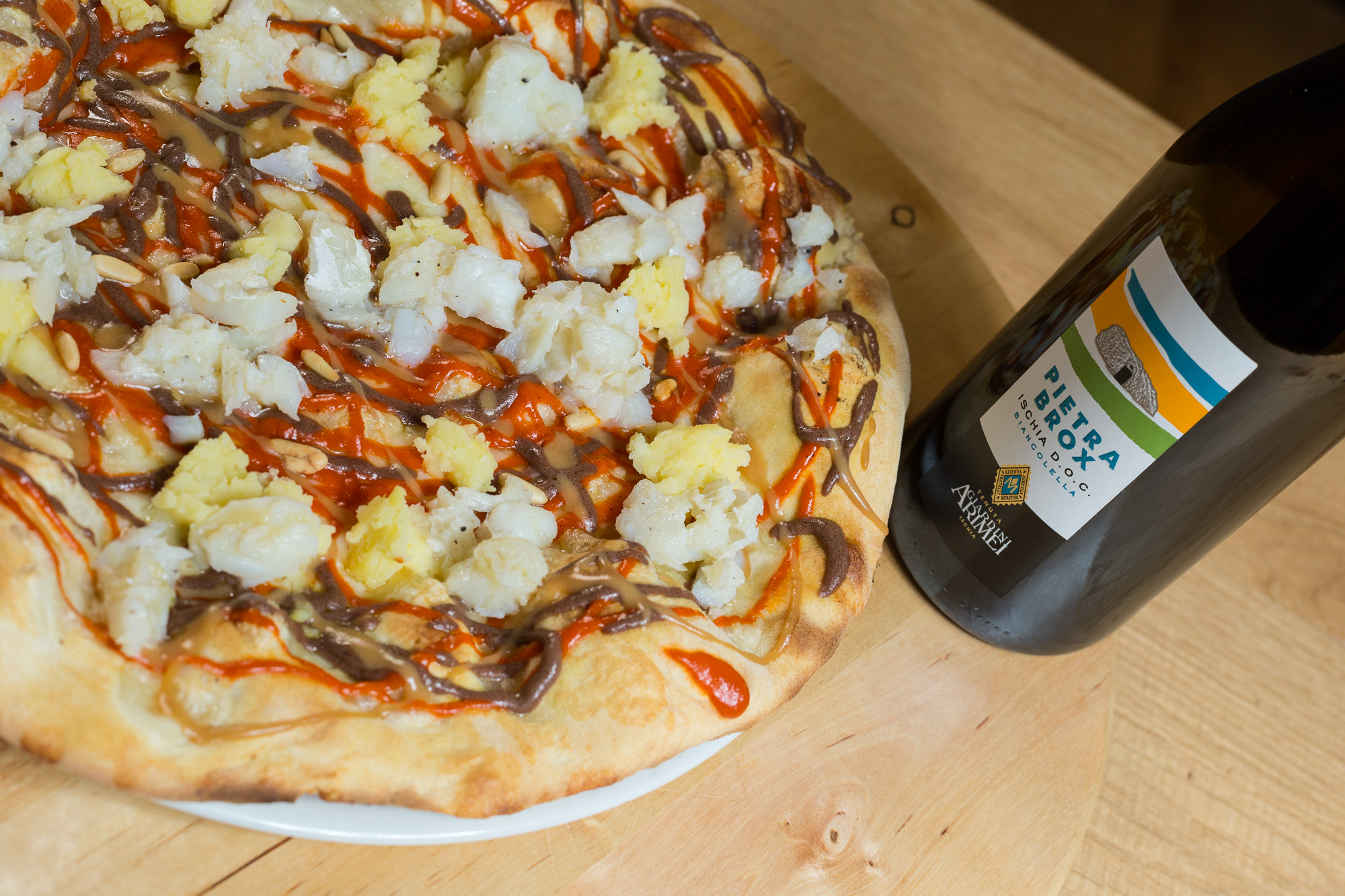 - Pizza bianca con fiordilatte, baccalà cotto a bassa temperatura, battuta di patate condite, pinoli, chips di pomodoro e gioco di salse ©Aromi Creativi_Ferrowine
